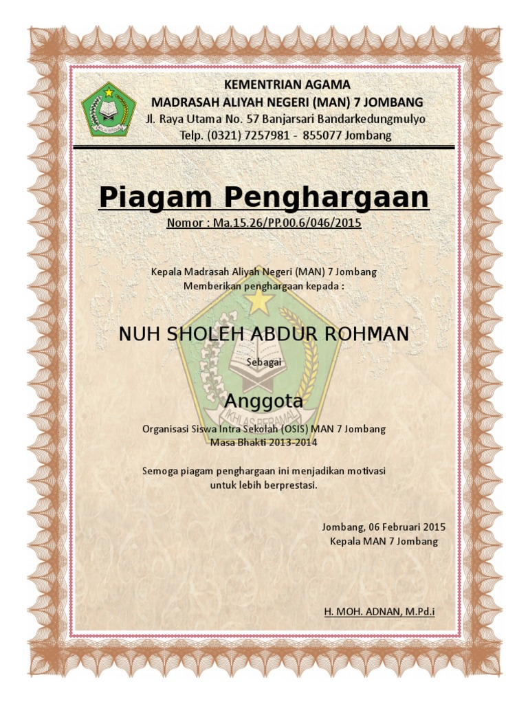 Contoh Piagam Penghargaan Pengurus Osis Beragam Informasi